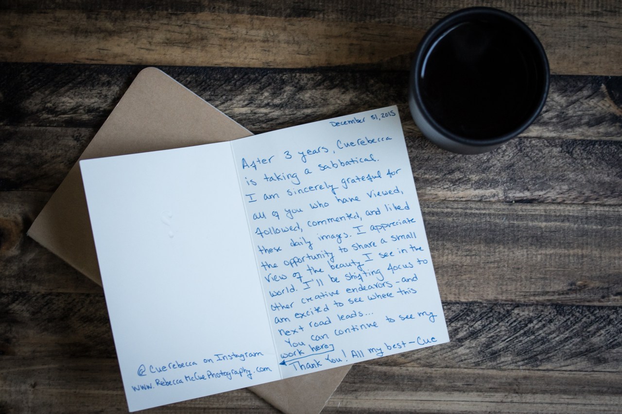 After 3 years, cuerebecca is taking a sabbatical.  I am sincerely grateful for all of you who have viewed, followed, commented, and liked these daily images.  I appreciate the opportunity to share a small view of the beauty I see in the world.  I’ll be shifting my focus to other creative endeavors – and am excited to see where this next road leads…
